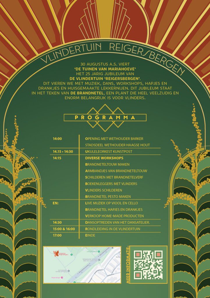 Bij de Vlindertuin zal er gedanst worden door 5 jonge danseressen van het Dansatelier Den Haag en muziek komt van de cellisten Beatriz Montes ( ochtend) en Martin Alvarez (middag). Vlinderverhaal zullen Irene en Corrie vertellen en Workshop Vlinderbloemen maken kan met Marie Jente en Caitlin.